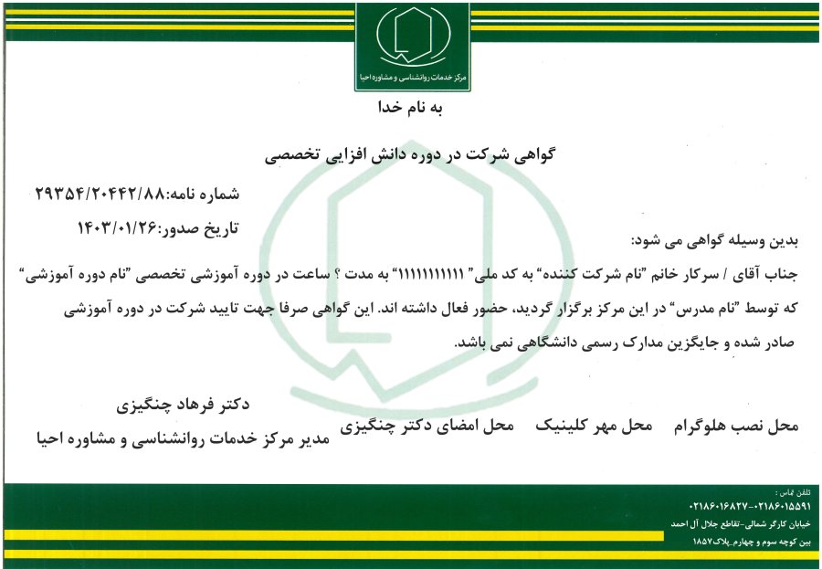 گواهی از: مرکز مشاوره احیا با مجوز سازمان نظام روانشناسی