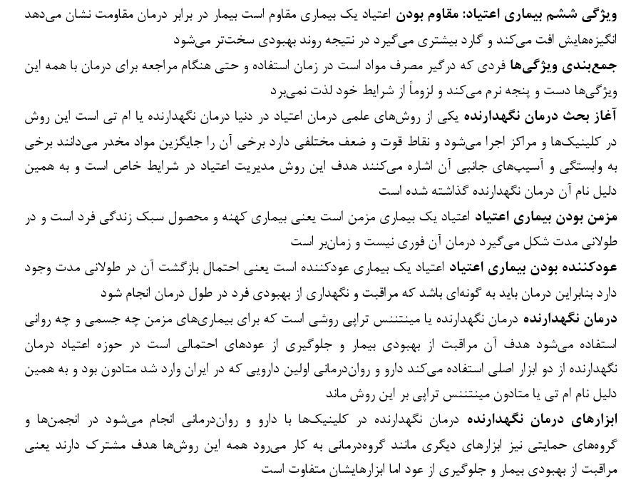 ویژگی اول بیماری اعتیاد: مزمن بودن اعتیاد یک بیماری مزمن است بیماریهای مزمن محصول سبک زندگی هستند و در طولانیمدت شکل میگیرند درمان آنها فوری نیست و نیاز به زمان طولانی دارد مانند بیماریهای جسمی قند فشار خون یا چربی اعتیاد نیز محصول سبک زندگی است و در طولانیمدت شکل میگیرد.