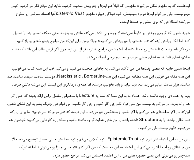 فوناگی میگه اگر شما خیلی سفت و سخت بیاید بگید: من نمیدونم، نه در حد واژه، بلکه جوری رفتار کنید که انگار هیچ ایده ای ندارید، سکوت هاتون بی معنا و طولانی باشه، نمی دونم ها، نمی فهمم ها یا تو بگوهاتون خیلی زیاد باشه، یا اگر جهت گیری ذهنی نداشته باشید و ساختار ذهنی مشخصی نداشته باشید، مراجع دچار احساس خلا، رها شدگی و یک پدیده ای به اسم عدم هدایت میشه.