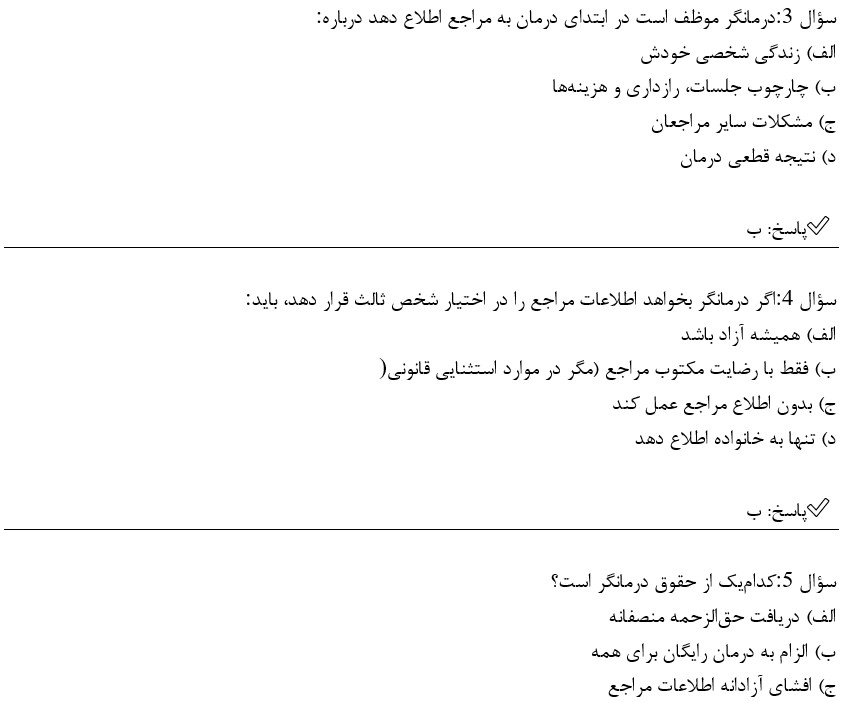 این سؤالات علاوه بر مرور نکات کلیدی، به شما کمک میکنند تا با چالشهای واقعی حرفه روانشناسی (از مدیریت اتاق درمان گرفته تا تصمیمگیریهای اخلاقی و قانونی) بیشتر آشنا شوید.